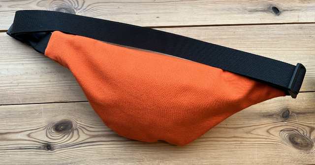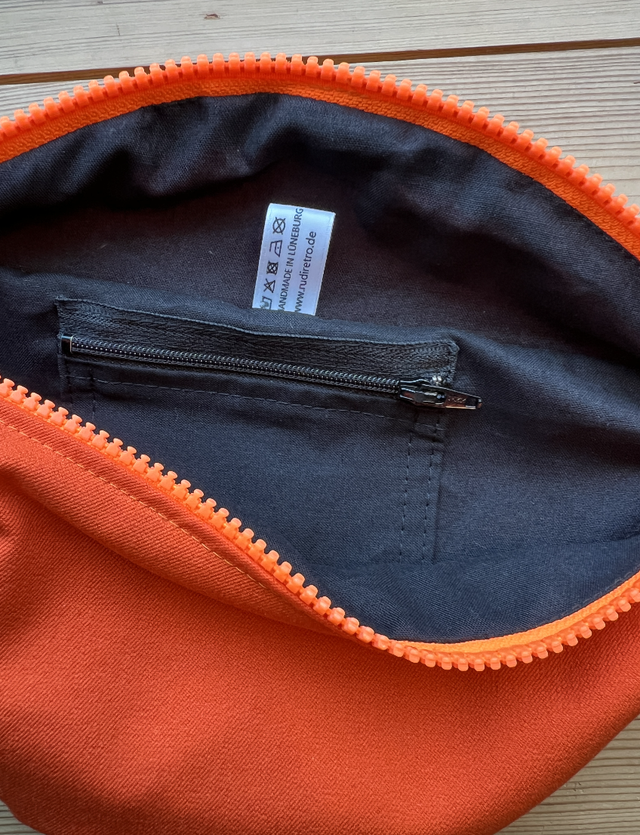 Bauchtasche aus orange-farbenem Reststoff mit praktischer Innentasche. In der Bauchtasche finden bequem Geldbeutel, Smartphone und Schlüssel oder Drehzeug Platz.
