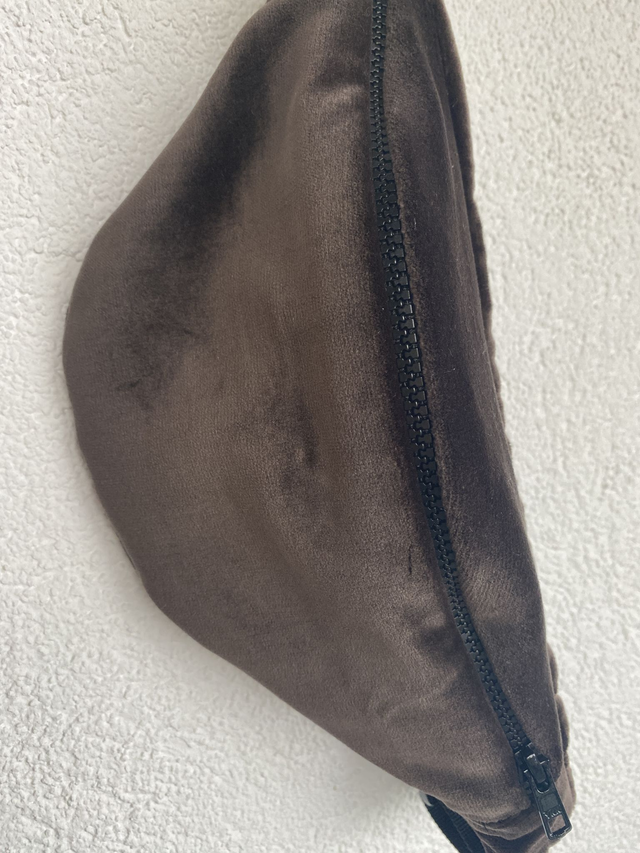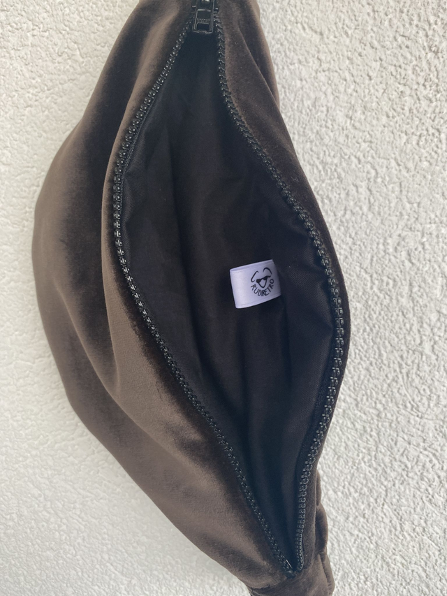 Bauchtasche aus braunem Baumwollsamt. In der Bauchtasche finden bequem Geldbeutel, Smartphone und Schlüssel oder Drehzeug Platz.